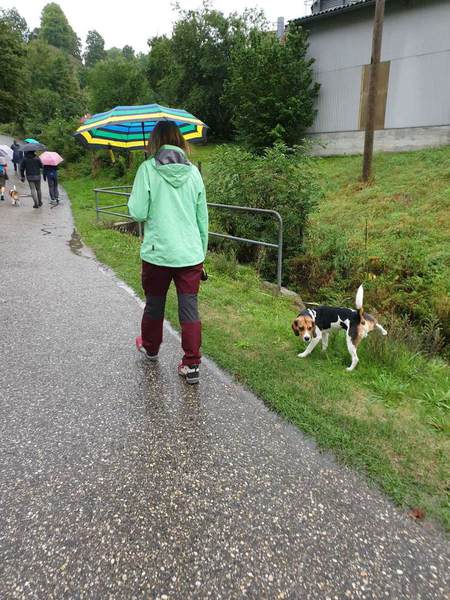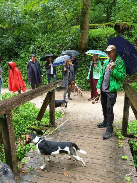 Familie Nordmann mit Beagle Wilma, hatten an diesem Samstag zu einer Beaglewanderung in Bad Urach eingeladen. Treffpunkt war um 10.00 Uhr auf dem Parkplatz vor dem romantischen Speisekaffee „Schlössle“ in der Wiesentalstrasse .