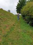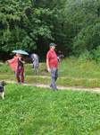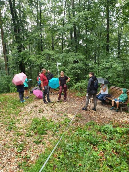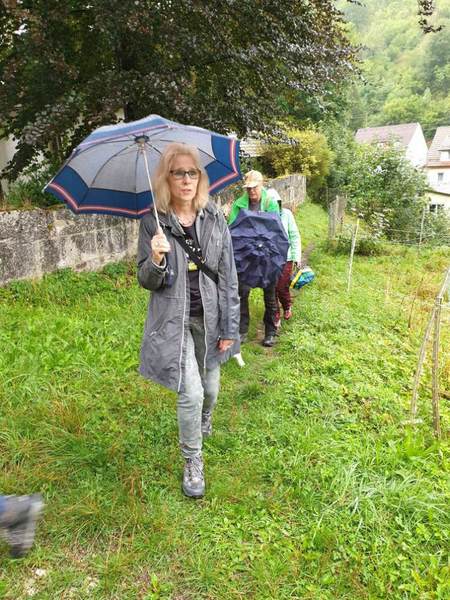 Ab hier führte der Weg weiter auf den Hochflächen hinüber zum Burgberg. Der Regen hatte zwischenzeitlich etwas nachgelassen, somit konnte der ein oder andere Regenschirm auch als Gehstock zum Einsatz kommen. Auch der Ausblick auf die gegenüberliegende Seite in Richtung Schloss Uhenfels war möglich.