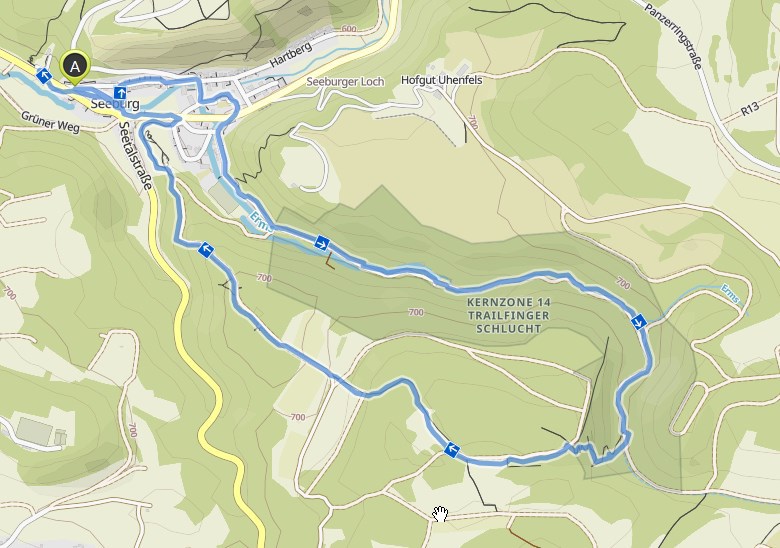 Der Wanderweg führte vom Startpunkt aus zunächst in südlicher Richtung auf dem Trailfinger Weg zum Ursprung der Erms-Quelle im wildromantischen Mühltal.