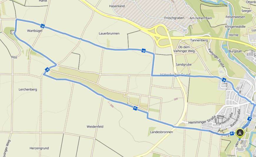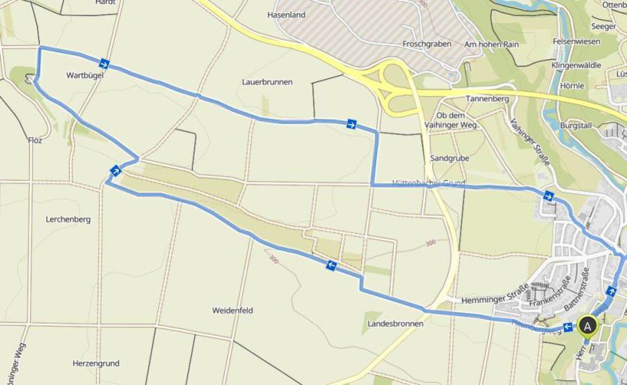 Der Wanderweg führte auf ebenen befestigten Wegen rund um die Felder in Schwieberdingen. Zunächst ging es entlang des Heimbergerweg in Richtung Wartbügel, nach einer Kehre ging weiter in Richtung Hüttenbacher Grund in Richtung Alte Vaihinger Straße. Dann wanderten wir entlang den Herrenwiesenweg weiter in Richtung Ausgangspunkt.