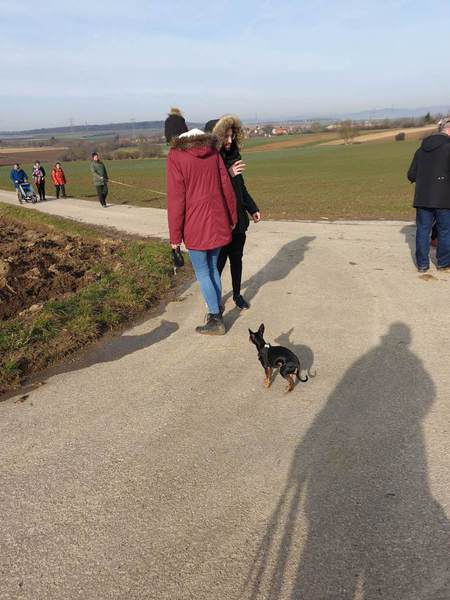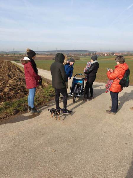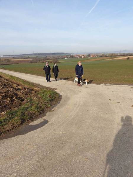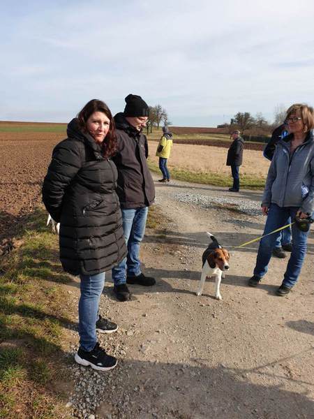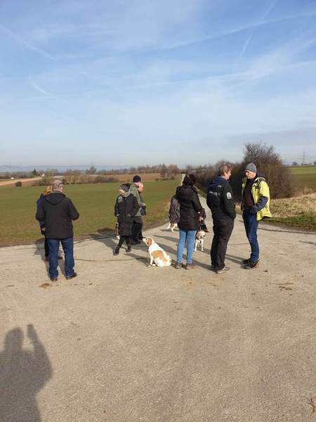 Der Einladung von Wanderwart Reinhard Hoppe zur Beaglewanderung in Schwieberdingen folgten 24 Personen mit 15 Hunden, darunter unser „fast Beagle“ „Billy“ und ein eindeutiger Non Beagle, unschwer zu erkennen. Trotz seinem Mangel an Körpergröße, die machte er durch sein Selbstbewusstsein wett, verschaffte sich der Kleine bei den Beagle´s erst mal Respekt, in dem er alle, die es seiner Meinung nötig hatten, ordentlich anknurrte und auch seine kleinen Zähnchen blitzen ließ. Nachdem die Fronten geklärt waren, legte sich die aufgebrachte Stimmung rasch. Treffpunkt war um 10.30 Uhr auf dem Parkplatz vor der Glemstalschule in Schwieberdingen.