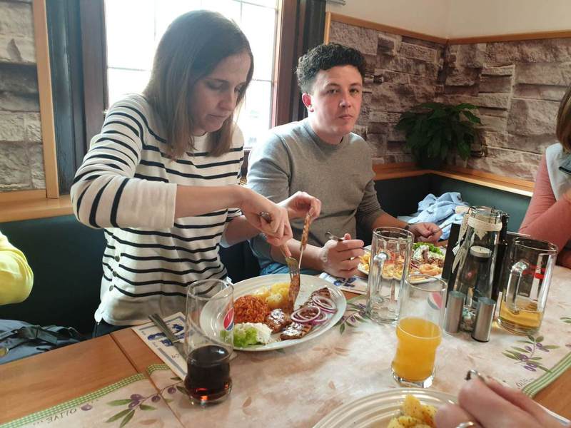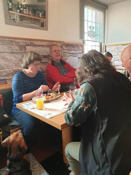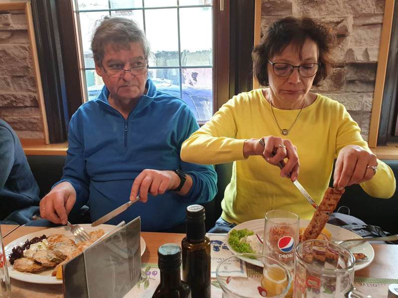 Nun galt es, die Zwei- und Vierbeiner restaurantfähig „herzurichten“. Auf dem Wanderweg über die Felder gab es doch die ein oder andere „Lehmstrecke“ zu bewältigen, was zu Spuren an den Wanderschuhen und sichtbaren Fellbeeinträchtigungen bei den Hunden geführt hat. Vom Parkplatz aus fuhren wir dann gemeinsam zum nahegelegenen Restaurant "Olympus“.