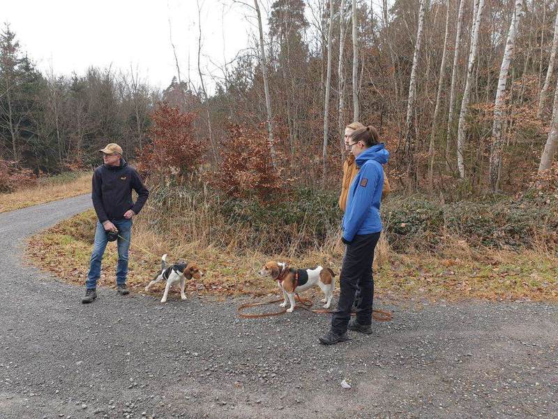 Auch die Gastteilnehmer kamen auf ihre Kosten und holten sich bei den ein oder anderen Beaglebesitzern Informationen und Meinungen ein. Damit es nicht nur bei der Theorie blieb, wurde ihnen kurzerhand Wilma anvertraut, um ein Feeling für Hund an der Leine zu bekommen. Wilma zeigte sich bei dem neuen Führerduo von ihrer besten Seite, sodass die beiden die Light-Version vom Beagle an der Leine vermittelt bekamen.