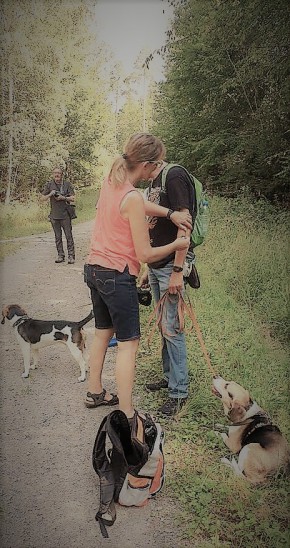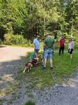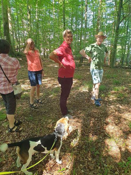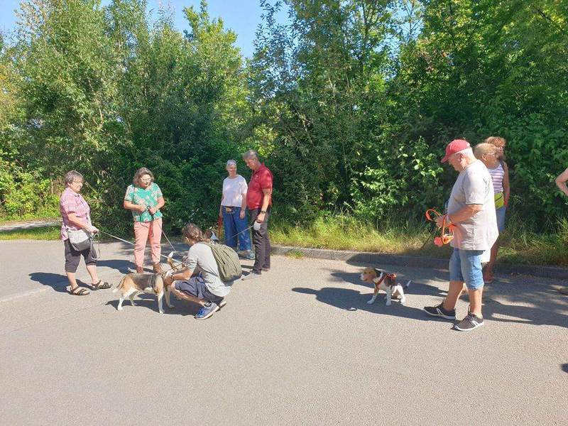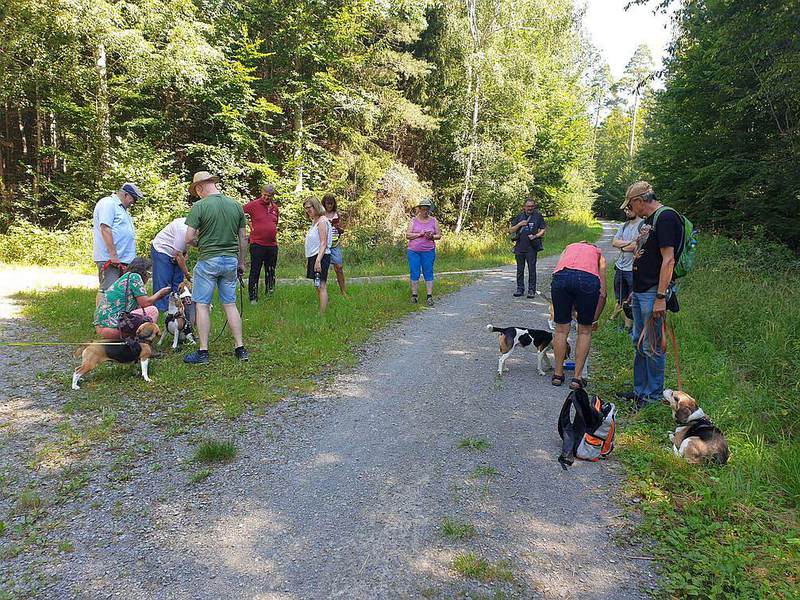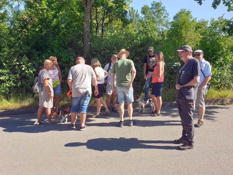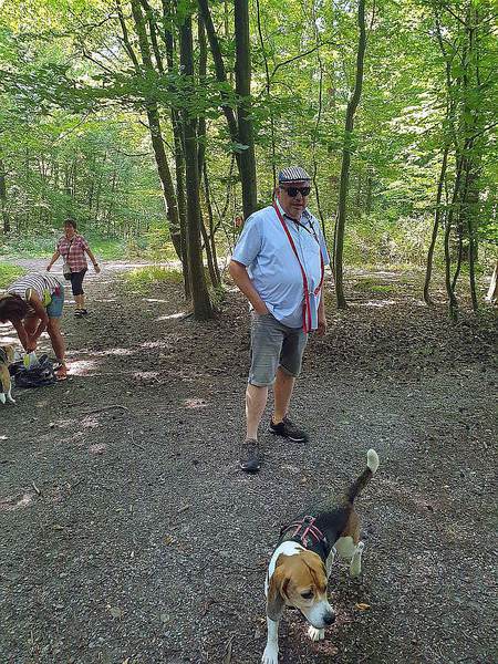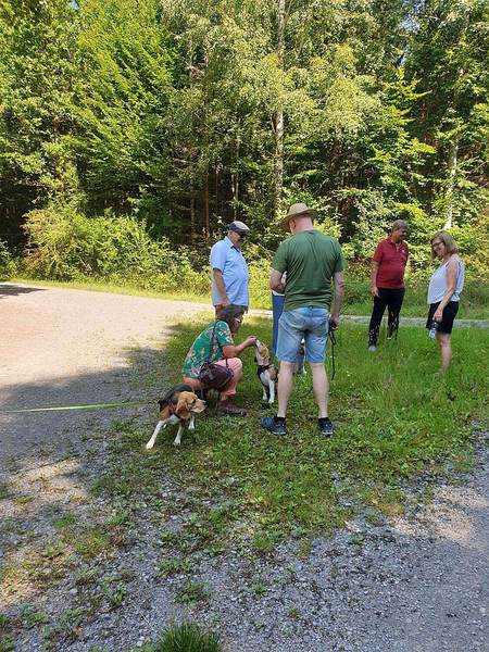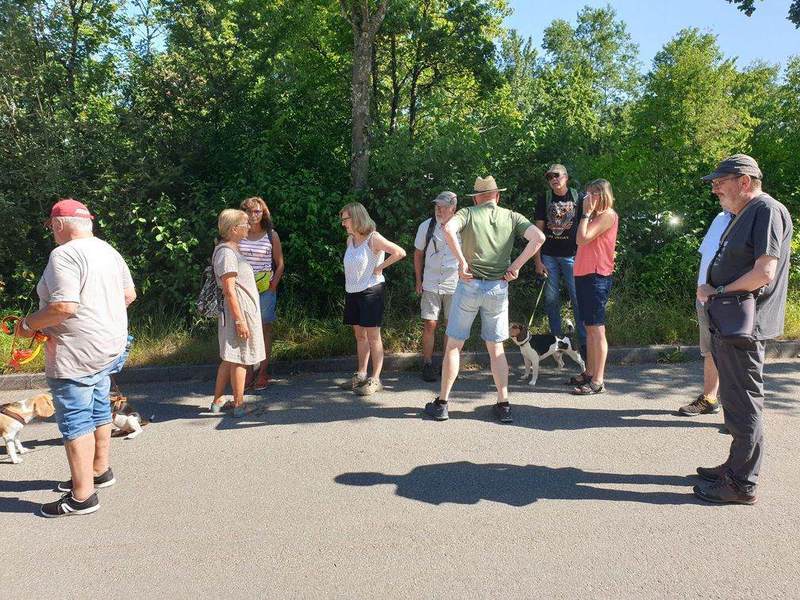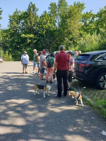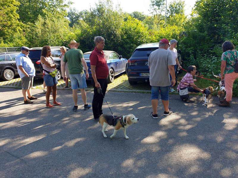 Auf dem Parkplatz trafen sich 19 Beagler mit 10 Beagle, darunter drei Junghunde. Der Generationenwechsel findet auch hier statt. Was alle besonders freute war, dass auch treue Mitglieder die Wanderung mitmachten, deren Vierbeiner bereits über die Regenbogenbrücke gegangen sind. Nachdem Vollzähligkeit festgestellt werden konnte, wurden die Teilnehmer vom Organisator mit Getränken für den kleinen Durst versorgt. Die Wettervorhersagen versprachen mit 28-30 Grad einen heißen Tag.