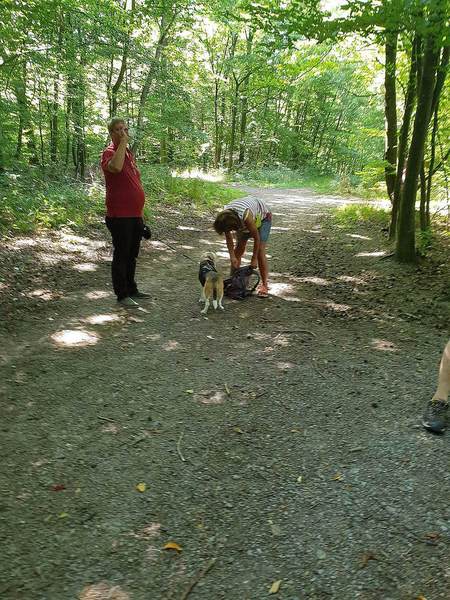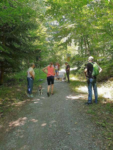Natürlich wurden immer wieder kleine Verschnaufpausen eingelegt. Für die Vierbeiner gab es hier noch ein Leckerli zur Motivation, falls diese notwendig sein sollte. Generell war der Weg gut begehbar, in einigen wenigen Abschnitten gab es jedoch kleine Hindernisse in Form von umgefallenen Bäumen. Für unsere Vierbeiner stellten die querliegenden Bäume kein Hindernis dar. Die geübten Wanderteilnehmer nahmen die Herausforderung als sportliche Einlage gerne an, eben Natur pur!