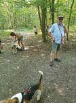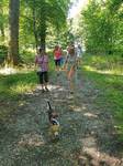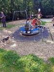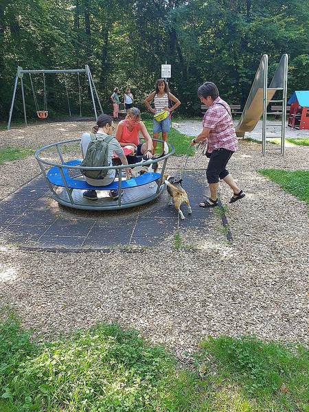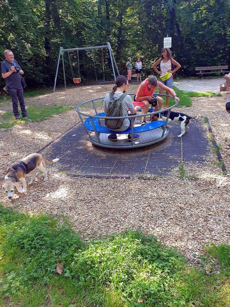 Der Wanderweg führte am Waldrand an einem Kinderspielplatz vorbei. Dort gab es auch ein Rundel welches natürlich von einigen Beagle Besitzerinnen sofort mit Hund ausprobiert wurde. Nur auf eindringlichen Hinweisen der Beagle Besitzer, dass möglicherweise dem Hund schlecht werden würde, konnten die Damen überzeugt werden…. „nur dem Hunde zuliebe …“