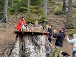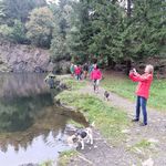Nachdem alle gestärkt waren, ging es weiter zur Besichtigung des Bergsees im Naherholungsgebiet der Ebertswiese. Um der vorhergegangenen Stärkung noch den letzten Schliff zu verleihen, hatte Frau Jung netterweise auf dem nahegelegenen Parkplatz noch eine kleine flüssige Stärkung (Klopfer) für die Wanderer auf zwei Beinen vorbereitet. So begaben sich die Wanderer beschwingten Schrittes auf den Rückweg