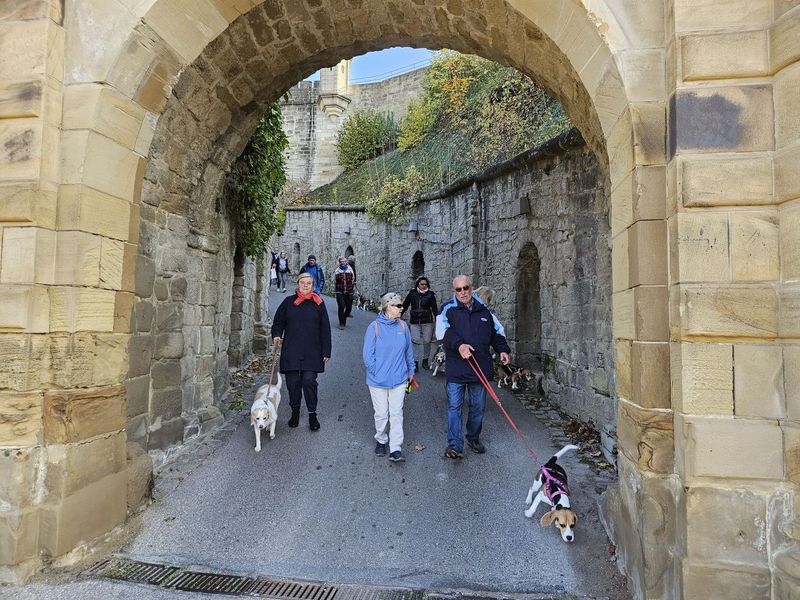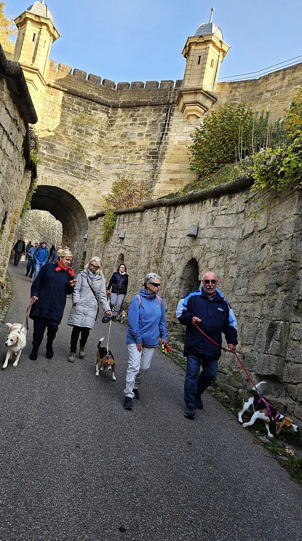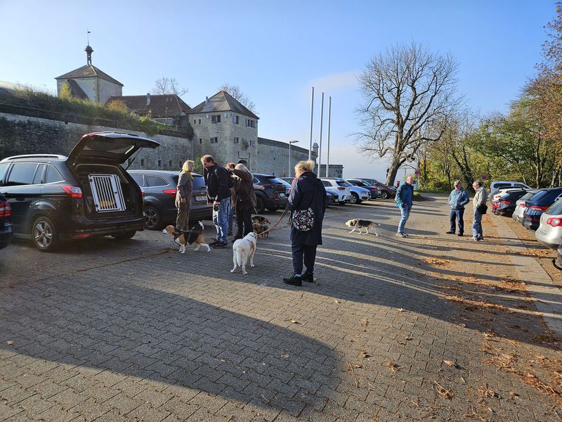 Die Einladung zur Beaglewanderung in Hohenasperg erfolgte von Familie Nordmann. Treffpunkt war am Samstag, den 09.11.2024 um 10:00 Uhr auf dem Parkplatz direkt vor der Festung Hohenasperg. Der Einladung folgten 24 Zweibeiner mit 13 Beagle sowie zwei non Beagle. Allein die Auffahrt durch das Löwentor zur Festung, die seit dem 18. Jahrhundert als Gefängnis diente und seit 1968 das Vollzugskrankenhaus der baden-württembergischen Justiz beherbergt, war bereits imposant und vielversprechend.