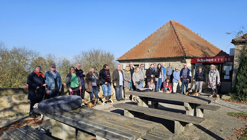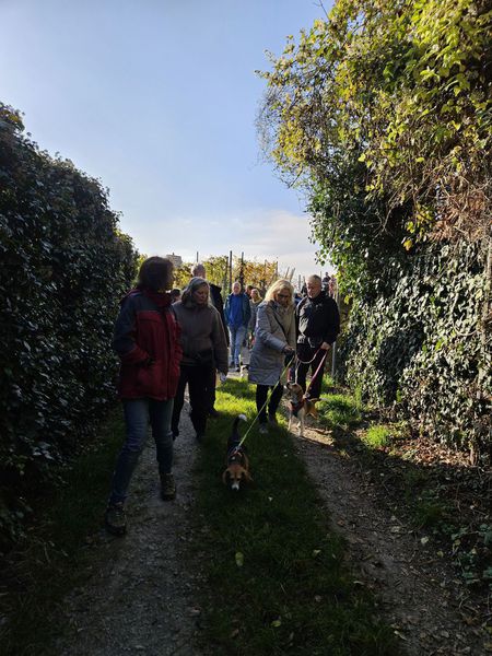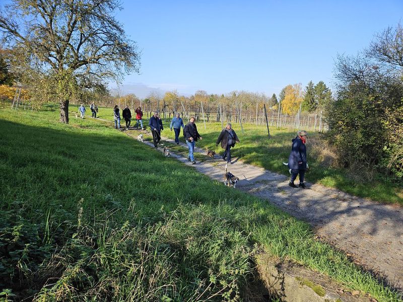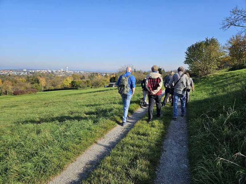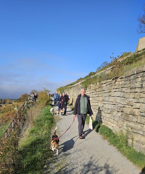 Anschließend ging es entlang an Winzeranbauhängen, zu den Schöckinger Weinbergen, von wo aus man eine schöne Aussicht Richtung Asperg genießen konnte. Die Steigungen hielten sich in Grenzen, sodass der Weg für alle Teilnehmer ohne große Anstrengung gut begehbar war und der Trupp gut vorankam. Zwischendurch wurden immer wieder kurze Verschnaufpausen sowohl für den Mensch und die Vierbeiner eingelegt.