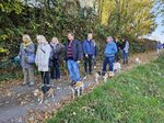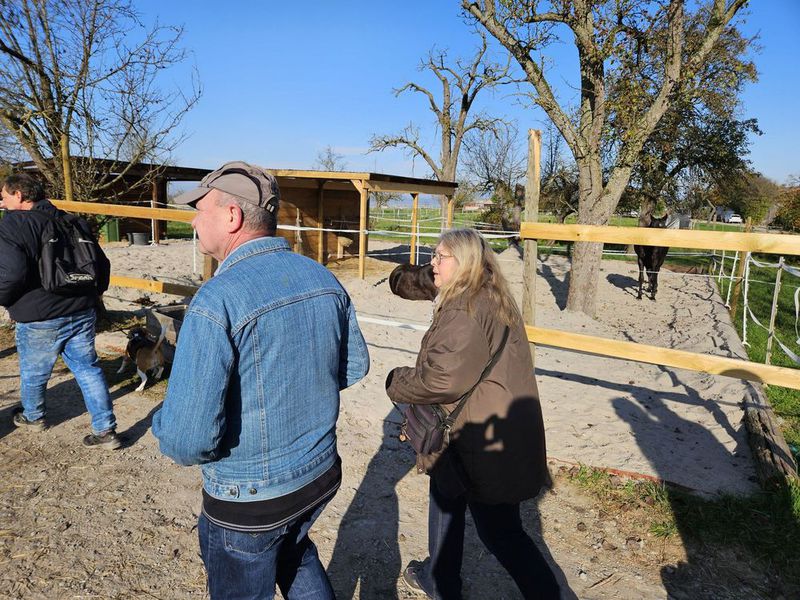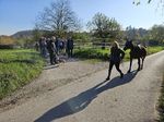 Auf der Strecke kreuzten unseren Wanderweg Reiter. Einige unserer Vierbeiner nahmen dies stillschweigend zur Kenntnis und zeigten kein Interesse, andere wiederum begrüßten die Entgegenkommenden recht lautstark. Im weiteren Verlauf des Weges kamen wir an verschiedenen Kleingärten und Pferdekoppeln vorbei.