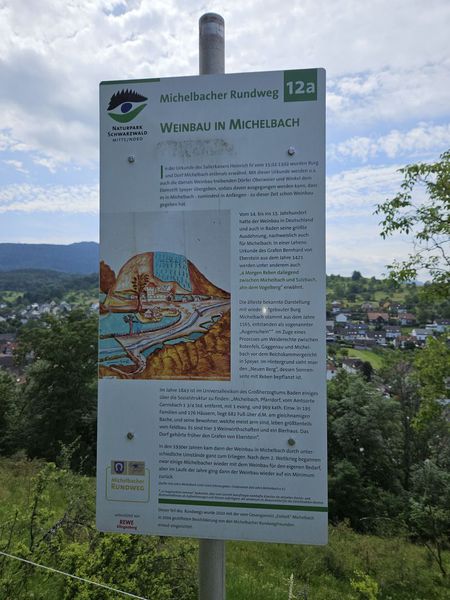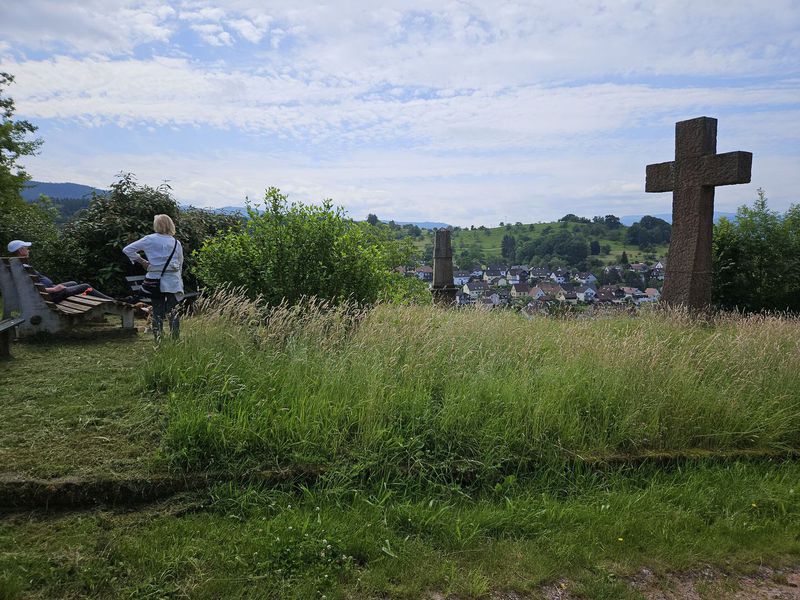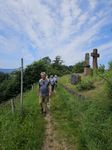 Anschließend ging es wieder leicht bergauf zum Neuen Berg (Kirchköpfel). Anschließend erfolgte der Einstieg in den Michelbacher Rundweg und den historischen Weinweg, der teils an sehr schöner Hanglage entlangführte, vorbei an Gedenkstätten mit Rastmöglichkeiten und sehr schönem Ausblick zum Merkur bei Baden-Baden, Richtung Hornisgrinde und auf die Schwarzwaldhochstrasse. Bei optimalem Wetter, waren sowohl die Vierbeiner als auch die dazugehörigen Frauchen und Herrchen nun im Wandermodus und konnten die Aussicht genießen.