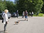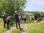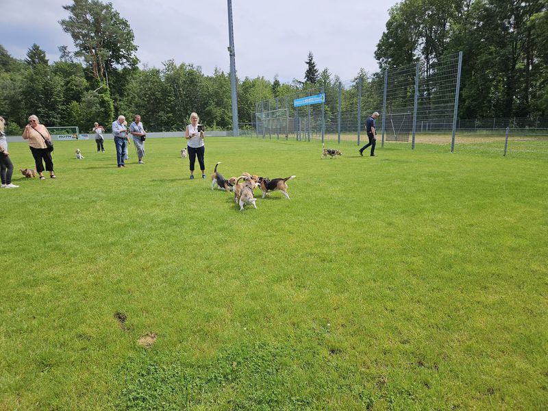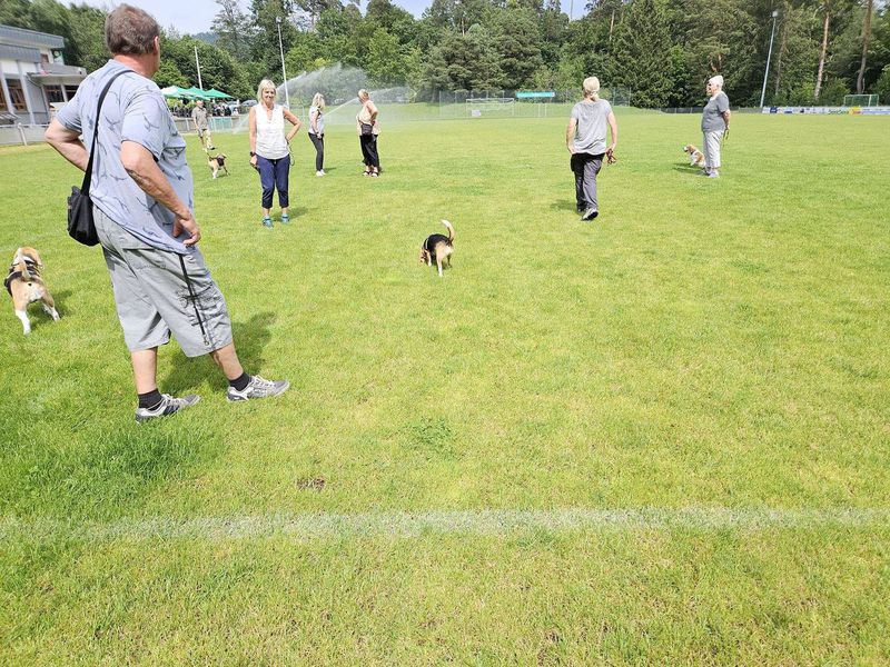 Nachdem alle gesättigt waren, kam der Hinweis, dass die Beagle sich auf dem unmittelbar angrenzenden und eingezäunten Sportplatz austoben können. Natürlich folgten wir gerne der Einladung. Einige Beagle hatten offensichtlich noch die erforderliche Energie und flitzten herum, andere waren wohl von der Wanderung schon ermüdet und begnügten sich damit, hier und da zu schnuppern. Für eine BEAGLE-EM Mannschaft reichte die Motivation dann doch nicht. ? Auch ein Rasensprenger war im Angebot und hätte für ein kühles Nass genutzt werden können, aber Wasserratten waren anscheinend auch keine dabei.