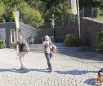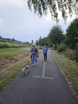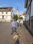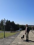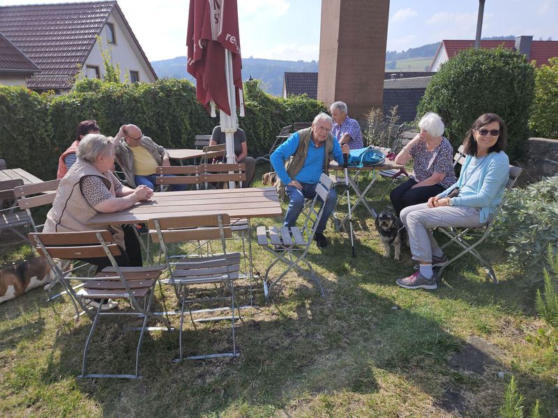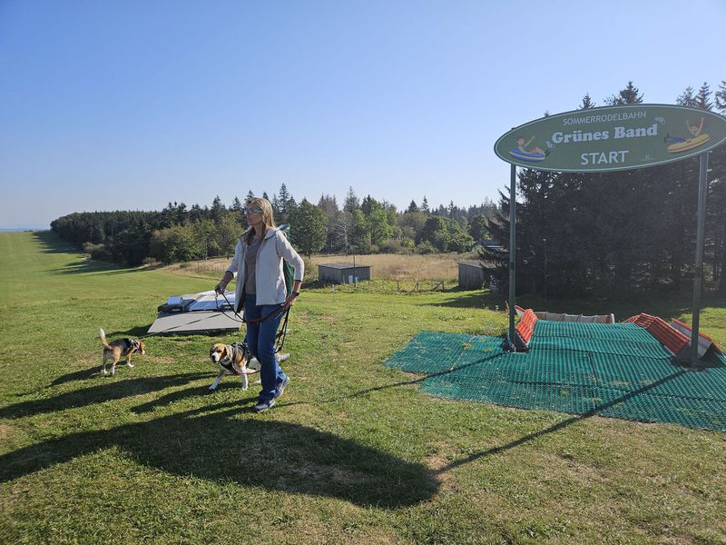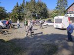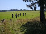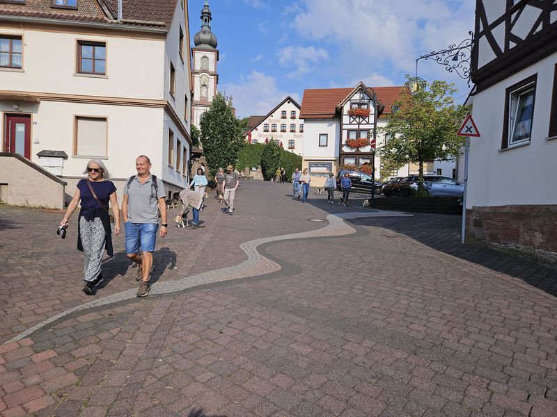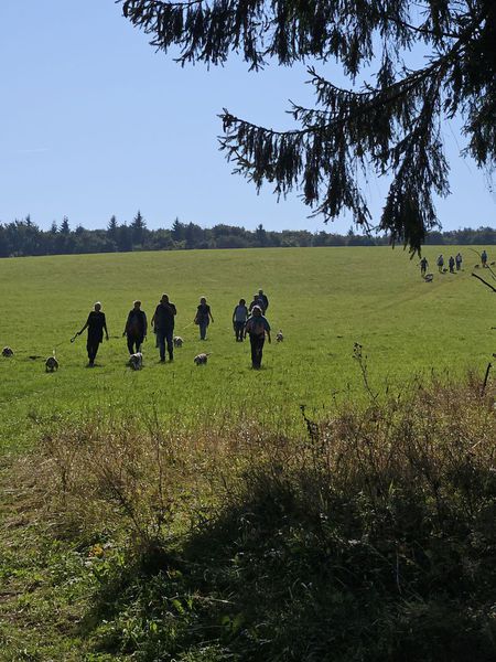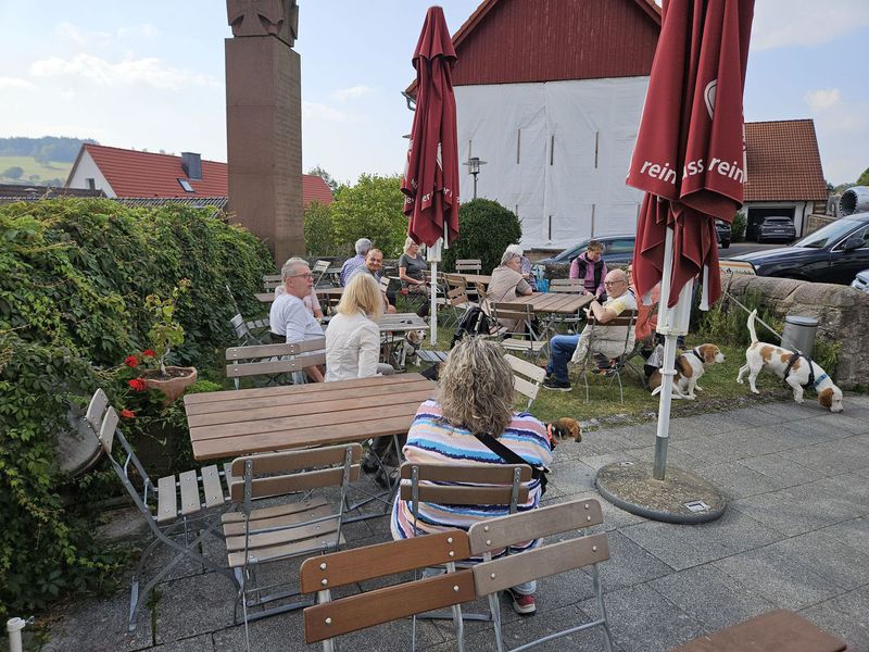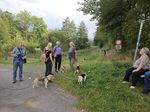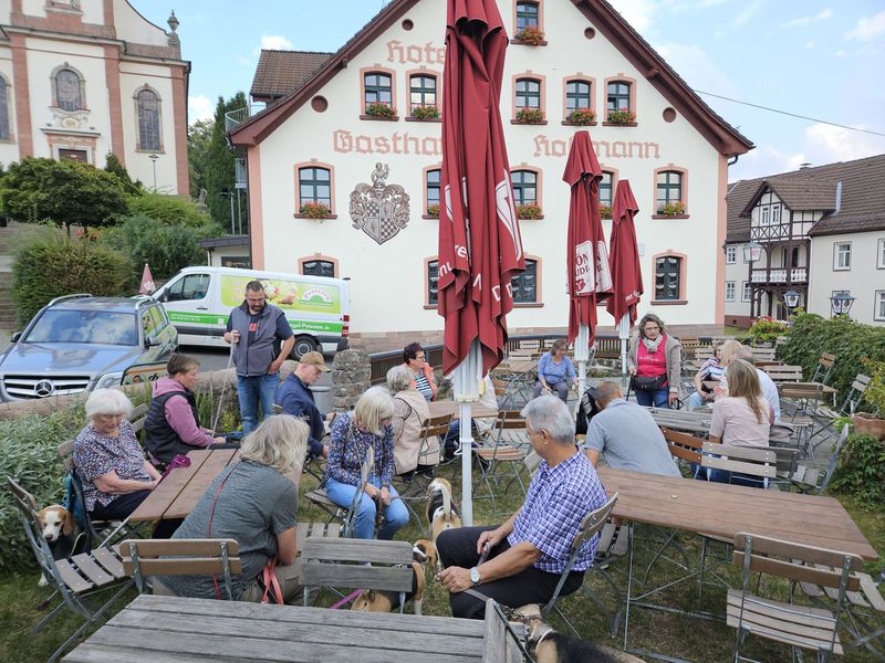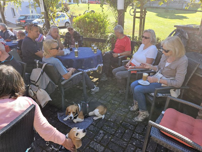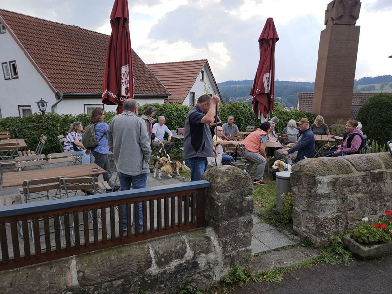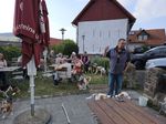 Am Donnerstagnachmittag trafen die Teilnehmer so nach und nach im „Hotel Gasthaus Hohmann“ in Hilders ein. Da dort gerade Mittagspause war, versammelten sich die Ankömmlinge mit ihren Hunden auf der Terrasse, wo sich alle, auch Teilnehmer ohne Hunde, schon mal begrüßen konnten. Nach Begrüßung der Zwei- und Vierbeiner wurden insbesondere die Neuzugänge ausgiebig beschnuppert. Mit dem Eintreffen von Herrn Hohmann konnten die gebuchten Zimmer nun bezogen werden. Einige Teilnehmer waren im Ort untergebracht andere waren bereits mit dem Wohnmobil in der Gegend und residierten auf einem Campingplatz. Gegen 16:00 Uhr war gemeinsamer Spaziergang auf dem Fischlehrpfad in Hilders geplant.