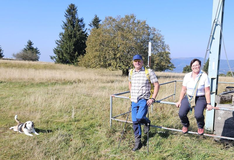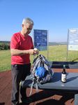 Nach einer ½ stündigen Anfahrt zum Wanderparkplatz starteten wir. Zunächst führte der Weg zum nahegelegenen dem Berg Ellenbogen (830m). Nach Betrachtung des Kunstwerkes und der optimalen Aussicht bei herrlichem Wetter, packte Udo Jung eine mitgebrachte Stärkung aus: „Rhöntropfen Kräuterbitter“. Nach Genuss von diesem Elixier begannen wir unsere Wanderung. Der Wanderweg führte über Wiesen entlang dem Jagdbrunnenweg stetig abwärts in Richtung Oberwied bis auf ca. 550m. Dort angekommen wurde im Gasthaus Silberdistel eine Pause mit Kaffee und Kuchen eingelegt.
