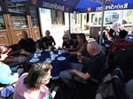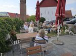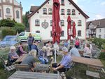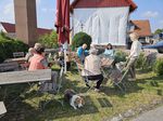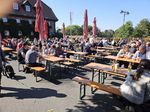So war zumindest der Plan. Nachdem die auf dem Weg liegenden Souvenirstände in Augenschein genommen wurden, überlegte man nun die Rast „sinnvoll“ zu gestalten. Es wurden einige freie Plätze im Biergarten gesichtet. Entspannt nahmen wir mit unseren Beagles Platz. Vor allem die Herren, in Aussicht auf ein frisches Klosterbräu mit gutem deftigem Essen, machten sich auf dem Weg zum Ausschank. Die Vorfreude auf dieses wurde jedoch angesichts der langen Schlange bei den Ausgabestellen jäh getrübt. Nachdem einige Wanderer, jedoch nicht aus unserer Gruppe, mit gut gefülltem Tablett, Schweinshaxen, Würste, Bier usw. an uns vorbeigingen und insichtlich der Anstellzeit gefragt wurden, kam eine ernüchternde Antwort, ca. 45 Minuten. Angesichts der anberaumten Rastzeit rückte das Mittagessen mit Klosterbier somit in weiter Ferne.