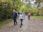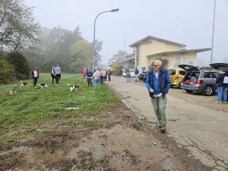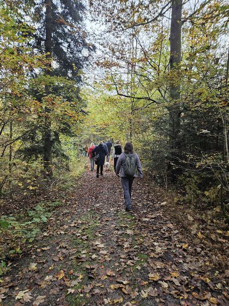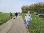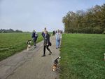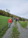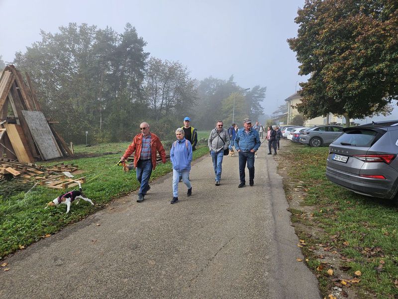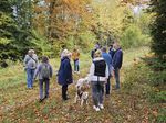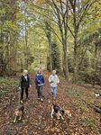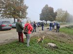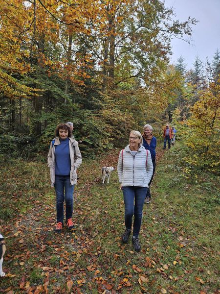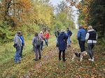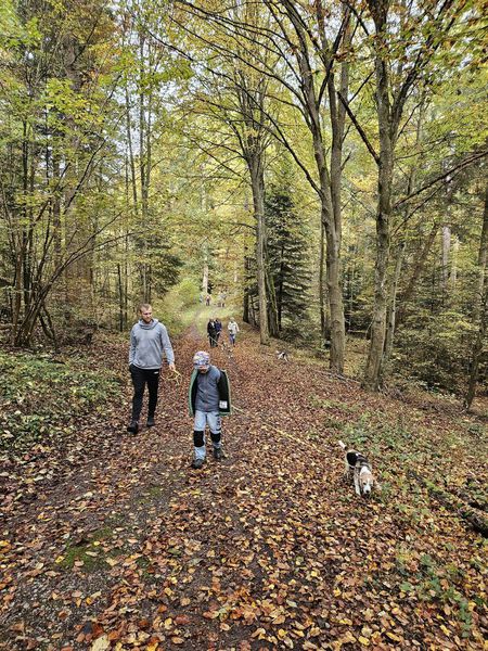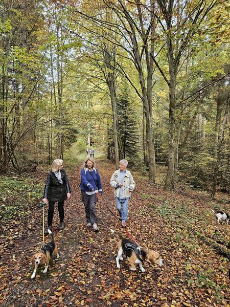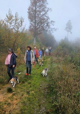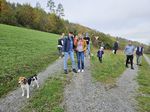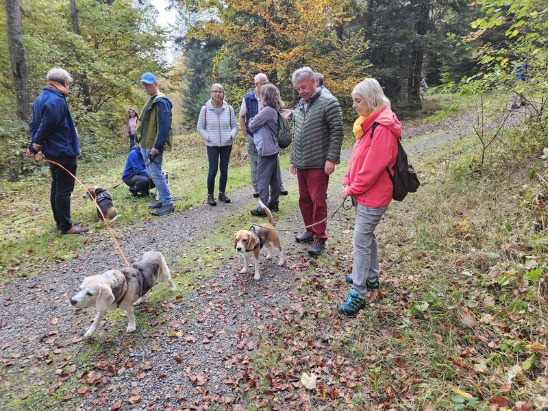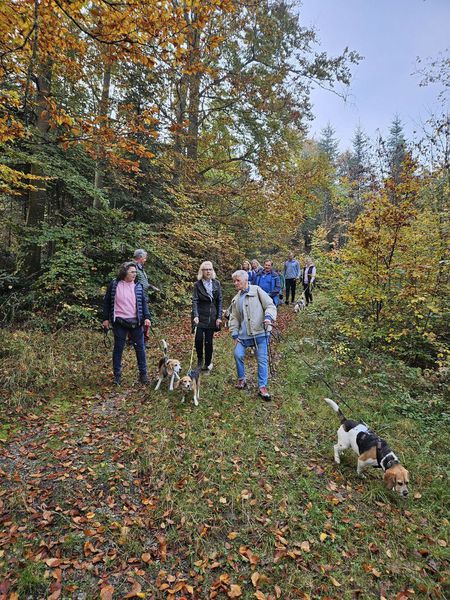 Der Wanderweg „zu den Linden“ führte uns über Wiesen und Felder. Zunächst in kleineren dann größeren Abschnitten ging es durch den Wald. Natürlich waren alle Beagle vorschriftsmäßig angeleint. Hier waren die herbstlichen Vorboten deutlich erkennbar. Teilweise hatte sich hier der Nebel aber auch schon verzogen und so kam die farbliche Herbstpracht im Mischwald voll zur Geltung. In Teilen war der Wanderweg mit vielen bunten Blättern nahezu vollständig bedeckt. Etappenweise gab es Haltepunkte, so dass alle wieder aufschließen konnten. Einige wenige hatten sich nach kurzer Zeit entschlossen den kürzeren Wanderweg zu nehmen. Diese Gruppe wurde von Ortskundigen geführt.