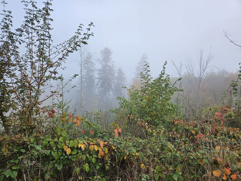 Die Wanderung startete nun wie geplant um 10.30 Uhr. Laut Wettervorhersage war nicht mit Regen zu rechnen, sodass wir trockenen Fußes unsere Wege gehen konnten. Allerdings hielt sich der Nebel so hartnäckig, dass die bei guter Wetterlage schönen Aussichten an entsprechenden Wegpunkten sehr eingeschränkt waren, sprich, man sah leider nichts.
