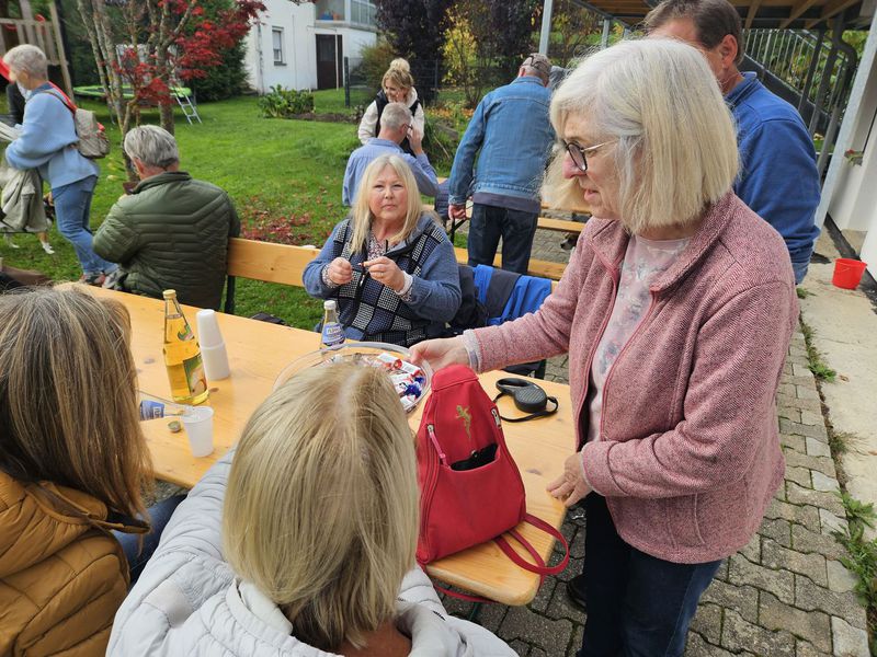 In Rohrdorf machten wir Rast im Garten der Fam. Bühler jun. Bei der ½ stündigen Pause wurden alle „Wandersleute“ mit Getränken, Süßigkeiten versorgt. Ja sogar Äpfel aus dem eigenen Garten wurden von einem kleinen „Apfelmädchen“ (Hilles Enkelin),? im Körbchen angeboten.