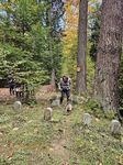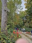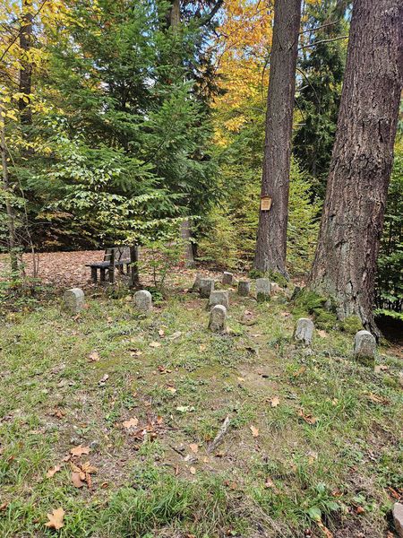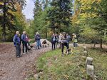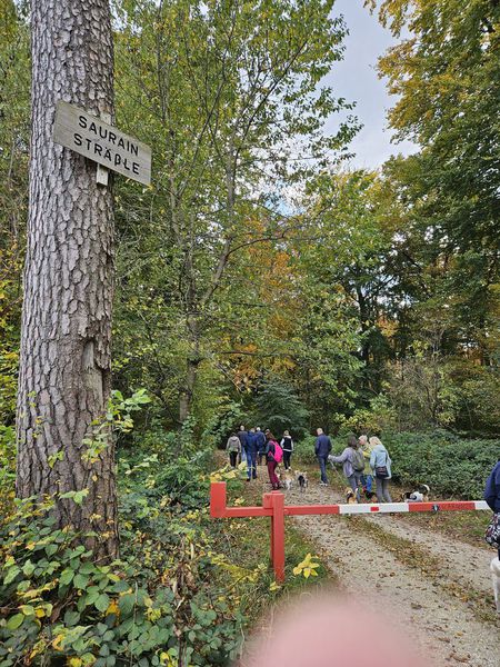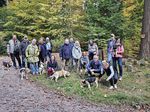 Der Wanderweg mündete dann in einen Waldweg. Dieser Wald, der Weg „gepflastert“ mit herabgefallenen Blättern präsentierte sich schon in den herrlichen Herbstfarben. Schließlich kamen wir, wie bereits von Günni angekündigt an einem Jagdhundefriedhof vorbei.