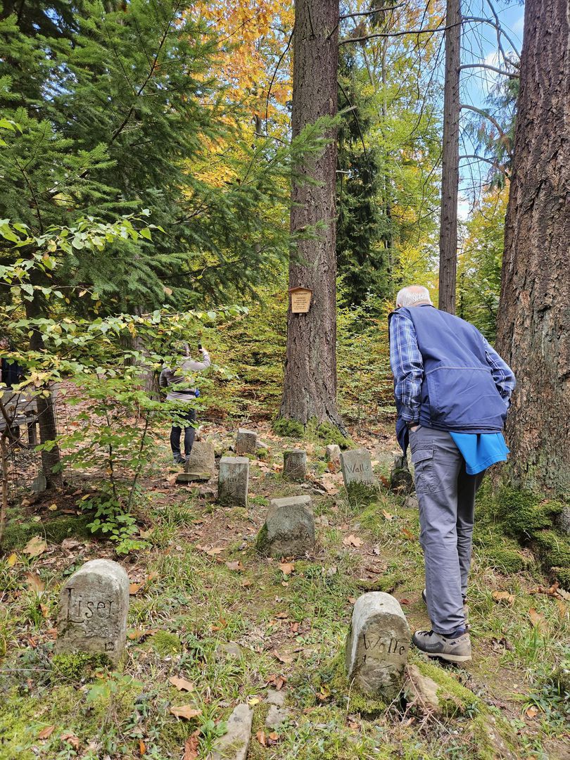 Der Jagdhundefriedhof befindet sich an einer Kreuzung im Wald zwischen Aichwald-Lobenrot. Hier erzählte uns Günni die dazugehörige geschichtliche Entstehung dieses Ortes.