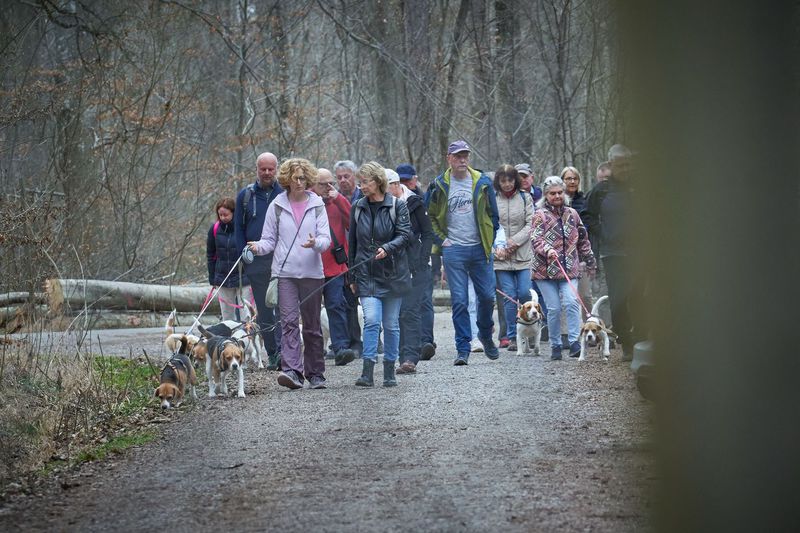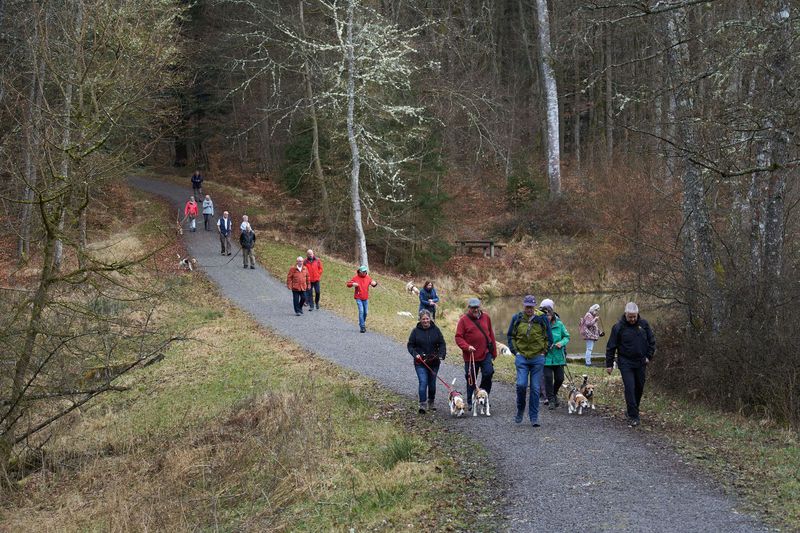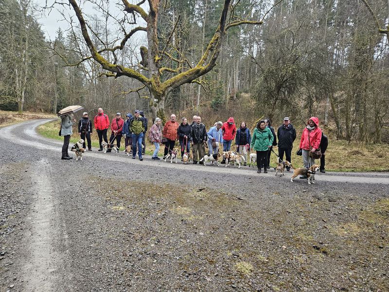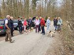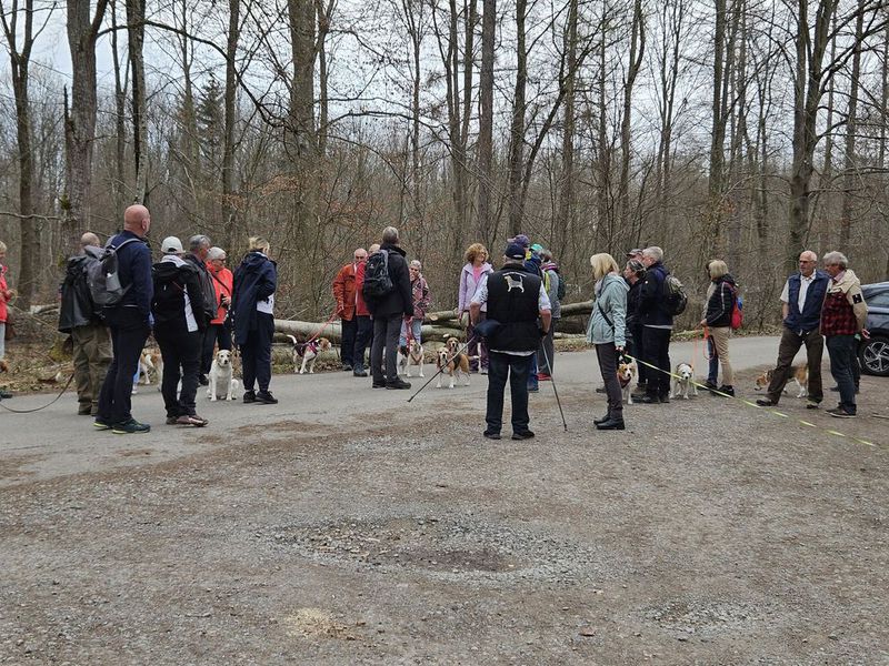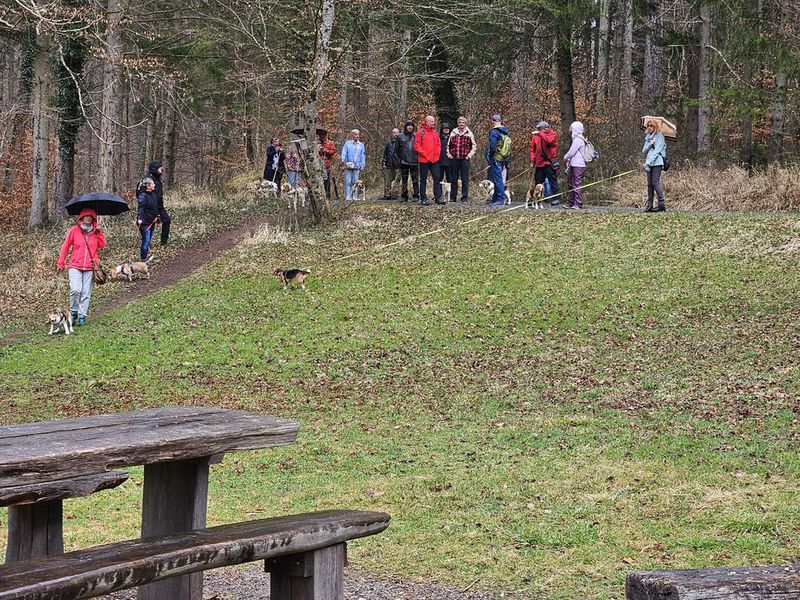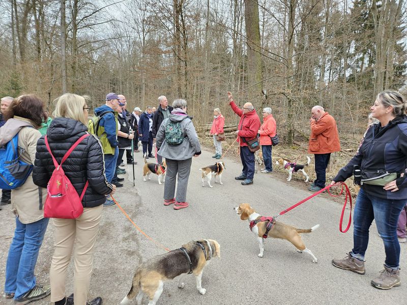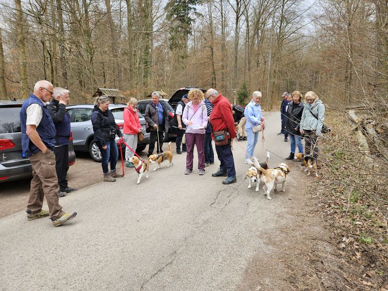 Nachdem alle Teilnehmer zielsicher am Parkplatz eingetroffen waren, heute 32 Personen mit 15 dazugehörigen Beagles (also wieder mal eine recht große Gruppe, darüber freuen wir uns) und Begrüßung derselben, gab Pieter einen kurzen Überblick über den Streckenverlauf. Es bestand für die Teilnehmer Mensch/Hund, die nicht so gut zu Fuß sind, bzw. gesundheitliche Einschränkungen haben, die Möglichkeit die Runde abzukürzen.