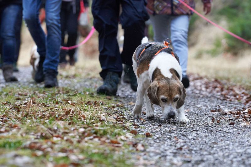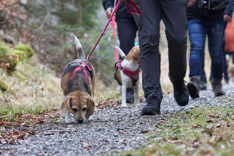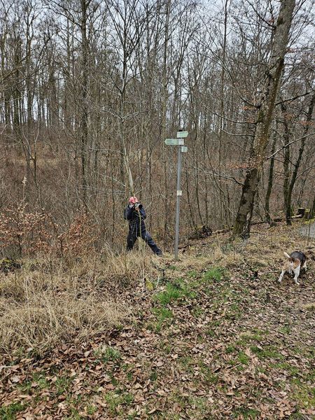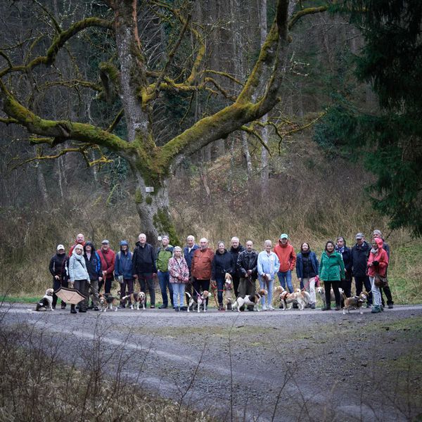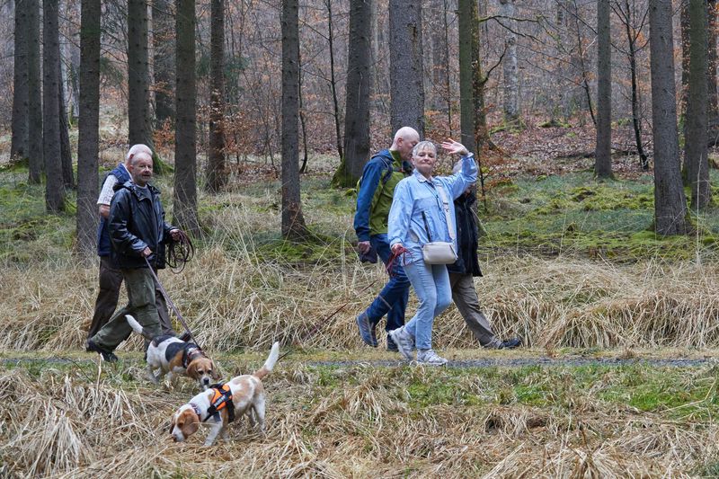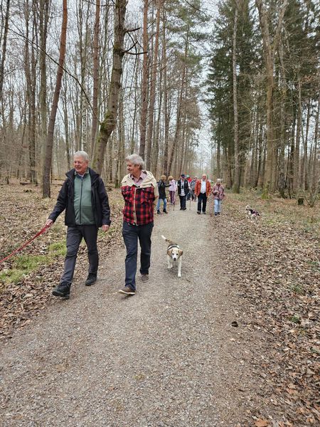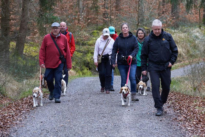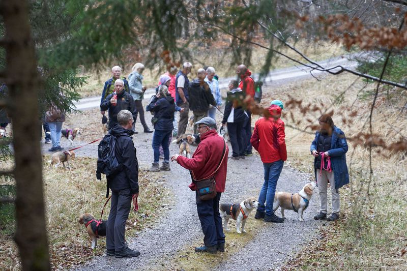 Nachdem alle Teilnehmer zielsicher am Parkplatz eingetroffen waren, heute 32 Personen mit 15 dazugehörigen Beagles (also wieder mal eine recht große Gruppe, darüber freuen wir uns) und Begrüßung derselben, gab Pieter einen kurzen Überblick über den Streckenverlauf. Es bestand für die Teilnehmer Mensch/Hund, die nicht so gut zu Fuß sind, bzw. gesundheitliche Einschränkungen haben, die Möglichkeit die Runde abzukürzen.